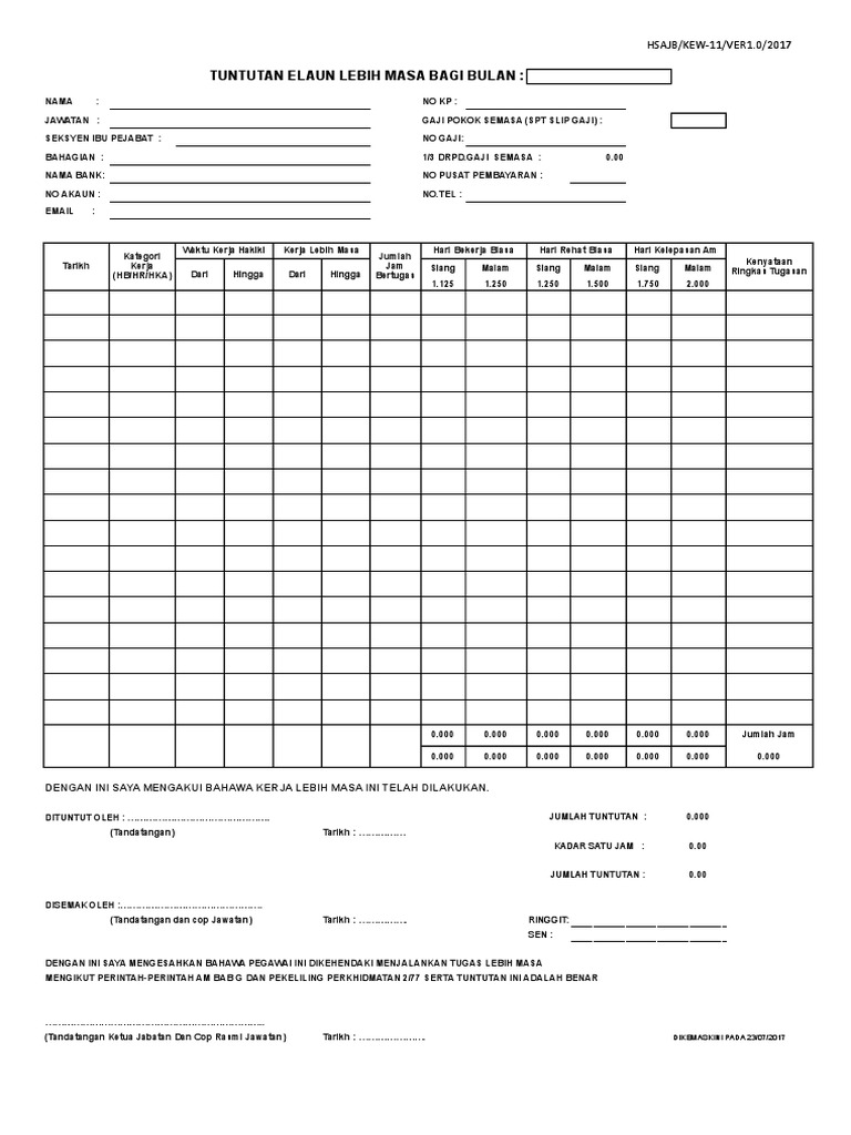 Elaun lebih masa bagi mac dituntut rm7 01 jam. Borang tuntutan elaun kerja lebih masa pdf free download. Surat pekelilingpejabatkewangannegeri sembilan bil 1 tahun 2017. 7.0 tarikh dikeluarkan 7.1 pekeliling dikeluarkan pada 1 april 2020. Sistem kelulusan bayaran lebih masa.
